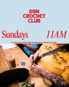 Calling all crafters! The DSM Crochet Club has a standing meeting at Plain Talk Books and Coffee every Sunday at 11 a.m. Come hang out and bring a craft (crocheting not required!). All are welcome in this inclusive crafting space!