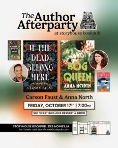 “Join us Friday, October 17 at 7pm for The Author Afterparty featuring Carson Faust & Anna North – Celebrating the releases of If the Dead Belong Here and Bog Queen Carson Faust’s debut novel about a girl gone missing and Anna North’s mystery about a preserved body recovered from an ancient bog are sure to both haunt and and heal as they reveal how our past shapes the present.”