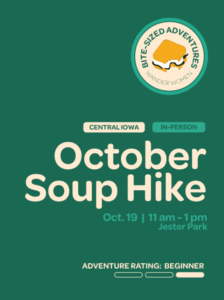 It’s soup season, baby! As the leaves change and the weather gets colder, sign up for a spot and take part in a soup hike. Explore the scenic Jester Park and warm up with a well-deserved soup lunch. Registration is limited, so be sure to sign up to get your soup!
