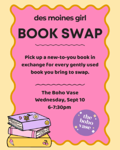 Join us IRL for a gathering to meet other girlies and cool people in Des Moines. The next meet up? A book swap with The Boho Vase on Wednesday, September 10.Â