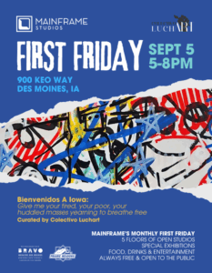 It is the first Friday of the month, and you know what that means: First Friday at Mainframe Studios! This month, experience “Bienvenidos a Iowa”, an inspiring exhibition curated by Colectivo Luchart. This exhibition embraces welcoming any and all to celebrate the richness of culture, community, and belonging, featuring immigrant, Latino/a/x, and Indigenous artists.